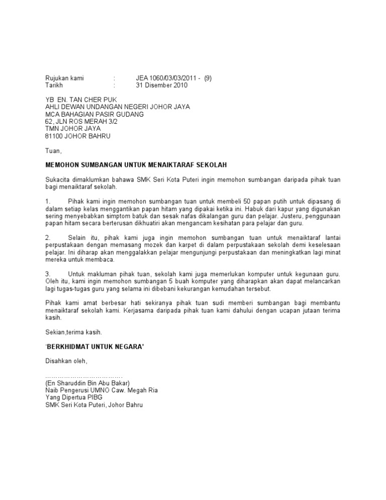 Contoh Surat Mohon Bantuan Kewangan Dari Yb : Surat mohon bantuan yb mp3 & mp4.. Diharap yang berhormat adun dapat meluluskan peruntukan tersebut demi kepentingan pedidikan anggaran semua kos peruntukan adalah sebanyak rm45000 ( empat ribu lima ratus sahaja).kertas kerja adalah seperti lampiran 1 berkembar. Jom pakat2 beli saham akhirat.kita bisnes dgn allah taala.bisnes yg dijamin tak akan rugi!pulangan amat amat amat lumayan menanti.janji allah itu pasti. Contoh surat rasmi memohon sumbangan buku contoh 36 via contoh36.blogspot.com. Surat surat mohon bantuan yb. Atas perhatian dan bantuan dari bapak/ ibu saya.