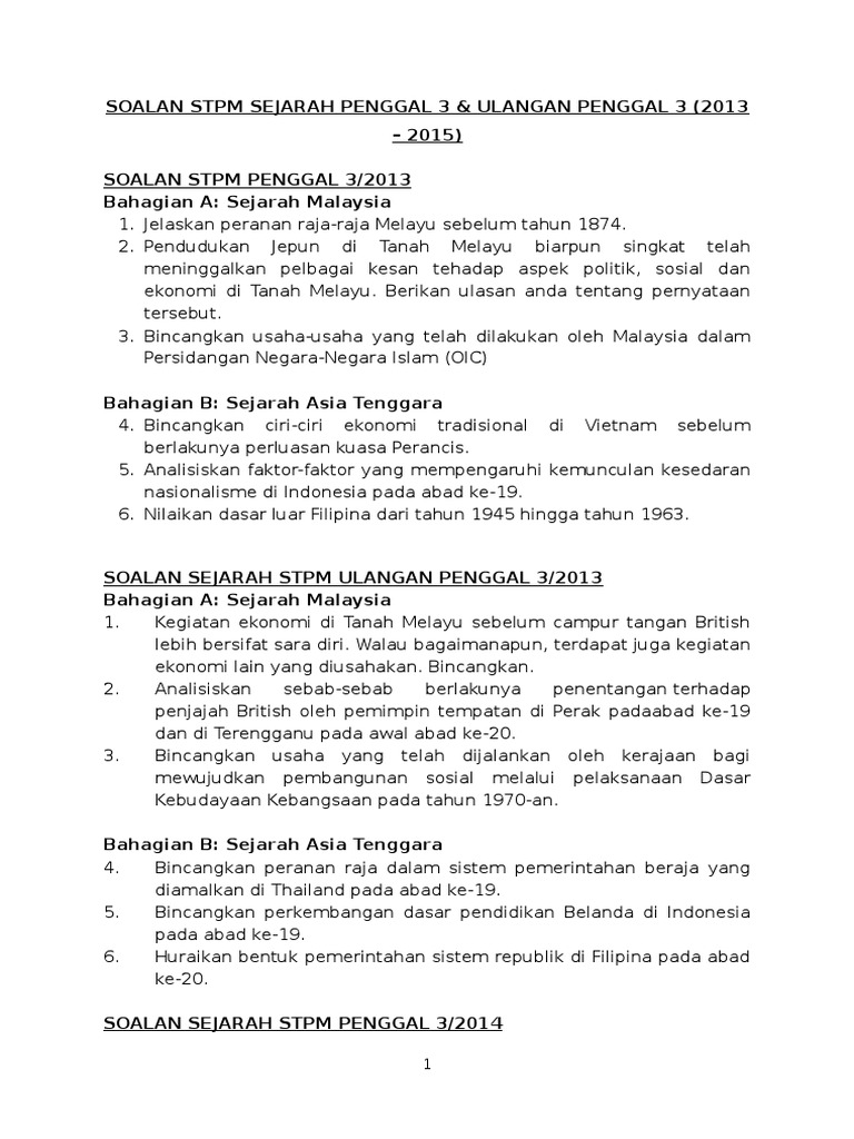 Jadual peperiksaan stpm penggal 1 2017. Sejarah dunia prakata modul pembelajaran dan pengajaran sejarah dunia (940/1) ini dihasilkan… modul sejarah untuk penggal satu stpm sistem modular. Stpm baharu juga merupakan sijil terbuka. Kertas ini rnernberi tumpuan kepada sejarah asia, eropah, dan arnerika syarikat dari tahun 1500 hingga tahun 1955. Sejarah 2 (islam) tema 1.