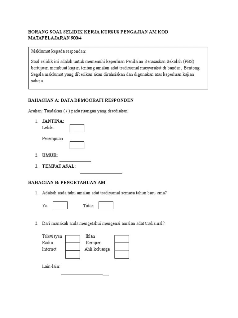 Demografi responden berdasarkan pekerjaan sumber: Kerja kursus ini wajib dilaksanakan oleh calon stpm, iaitu calon sekolah kerajaan, calon sekolah banttuan kerajaan,c alon sekolah swasta dan calon persendirian individu sebagai sebahagian komponen. Pbs pengajian am stpm 2013 penggal 2 contoh untuk dijadikan panduan. Manual kerja kursus ini disusun bagi membantu calon untuk menghasilkan kerja kursus bagi mata pelajaran pengajian am. Moshims contoh borang soal selidik pengajian am perubatan. Contoh kerja kursus pbs stpm pengajian am 4 1. Pengkaji juga menggunakan kaedah rujukan perpustakaan bagi mendapatkan maklumat. 1 1.1 abstrak adat menyambut kelahiran bayi dalam kalangan masyarakat cina di taman maju satu, sungai jelok, kajang. Antara rujukan yang digunakan ialah daripada laman sesawang , buku rujukan , majalah , orang sumber dan manual pelajar pengajian am. Pandangan golongan muda sangat penting kepada pengkaji untuk mengetahui pendapat mereka tentang biskut tradisonal ini. Sebagai contoh, tekanan bekalan air ini memang telah menganggu rutin keharian penduduk. Antara rujukan yang digunakan ialah daripada laman sesawang buku rujukan majalah orang sumber dan manual pelajar pengajian am. Klik di sini untuk merujuk contoh pbs pengajian am 900/4 2.